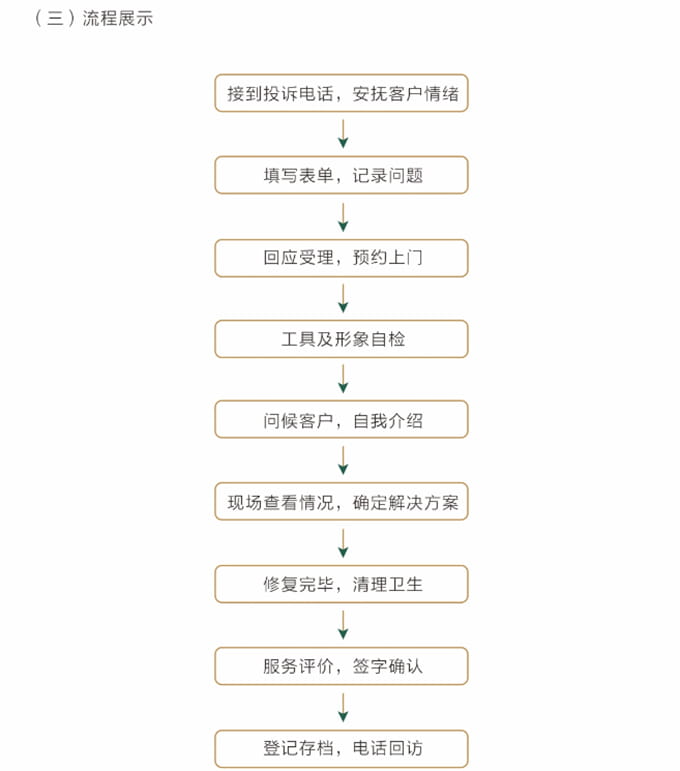 必須按照客戶約定,至少提前5分鐘上門,見(jiàn)到客戶時(shí)需自我介紹,并出示上崗證和名片,在進(jìn)入顧客家前應(yīng)穿上自備的鞋套。征得客戶同意后開始維修,嚴(yán)禁亂收費(fèi)。