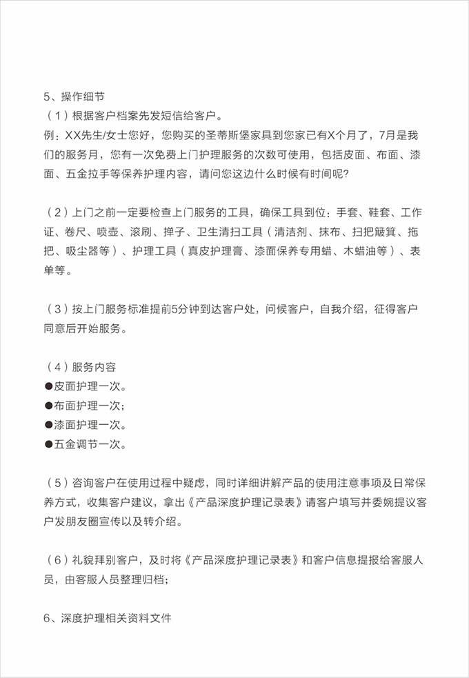 話術(shù)參考:“**先生/女士您好,我是圣蒂斯堡的售后服務(wù)人員**,您購(gòu)買的圣蒂斯堡家具已經(jīng)全部到貨了,送貨安裝大約需要**時(shí)間,請(qǐng)問(wèn)您這邊什么時(shí)候方便我們上門送貨安裝呢?”同時(shí)要了解送貨小區(qū)的電梯、樓道、入戶門的尺寸等,提前做好準(zhǔn)備,避免意外情況。最后確定送貨時(shí)間(安裝所需要時(shí)長(zhǎng)),并告知客戶安裝人員的相關(guān)信息,可加微信發(fā)送,并發(fā)送配送安裝流程說(shuō)明。