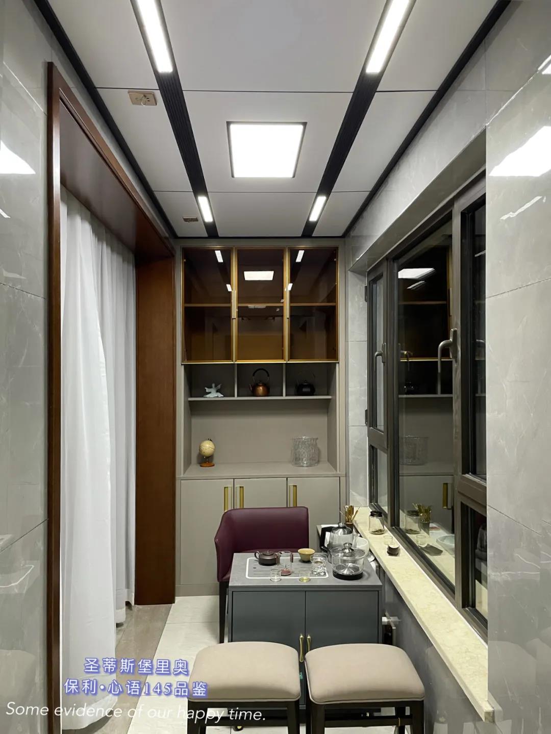 ▲餐廳一面及頂?shù)耐该鞴耋w,以簡練的金屬線條分割出收納空間,讓立面視覺更顯精致干凈。餐邊柜設(shè)置了臺面、全玻璃展示區(qū)以及隱藏收納區(qū),滿足了日常生活中多樣的收納需求。