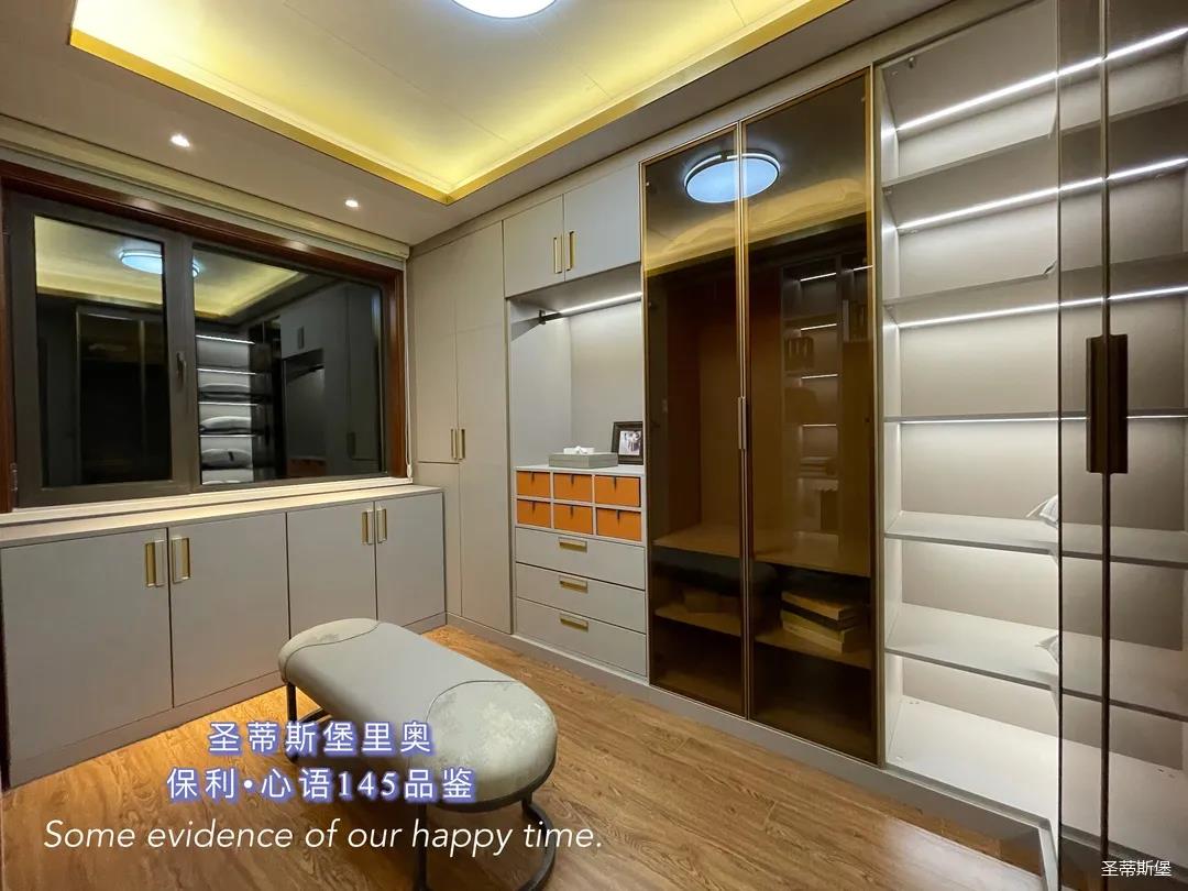 ▲衣帽間是用一間房改造的,衣柜開放式的布局處理,不但釋放了空間的狹隘,也營造出了具有觀賞性的空間格局,淺灰色調(diào)打造柜體基底,凝練出現(xiàn)代簡約的生活質(zhì)感。柜體中安裝感應(yīng)燈帶,光線流瀉其中,襯托出材質(zhì)的自然肌理,溫潤細致的實木與剛硬冷冽的低奢金屬相互交織出一個極具質(zhì)感的儲物空間。