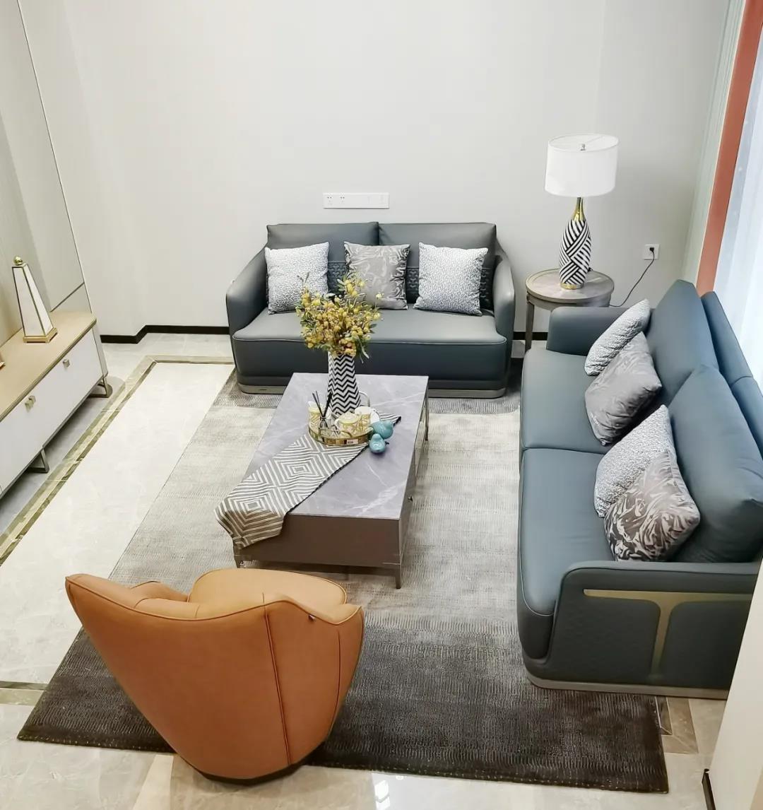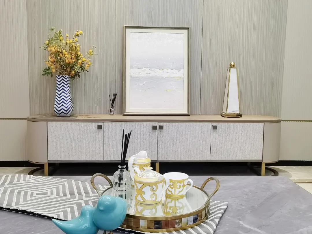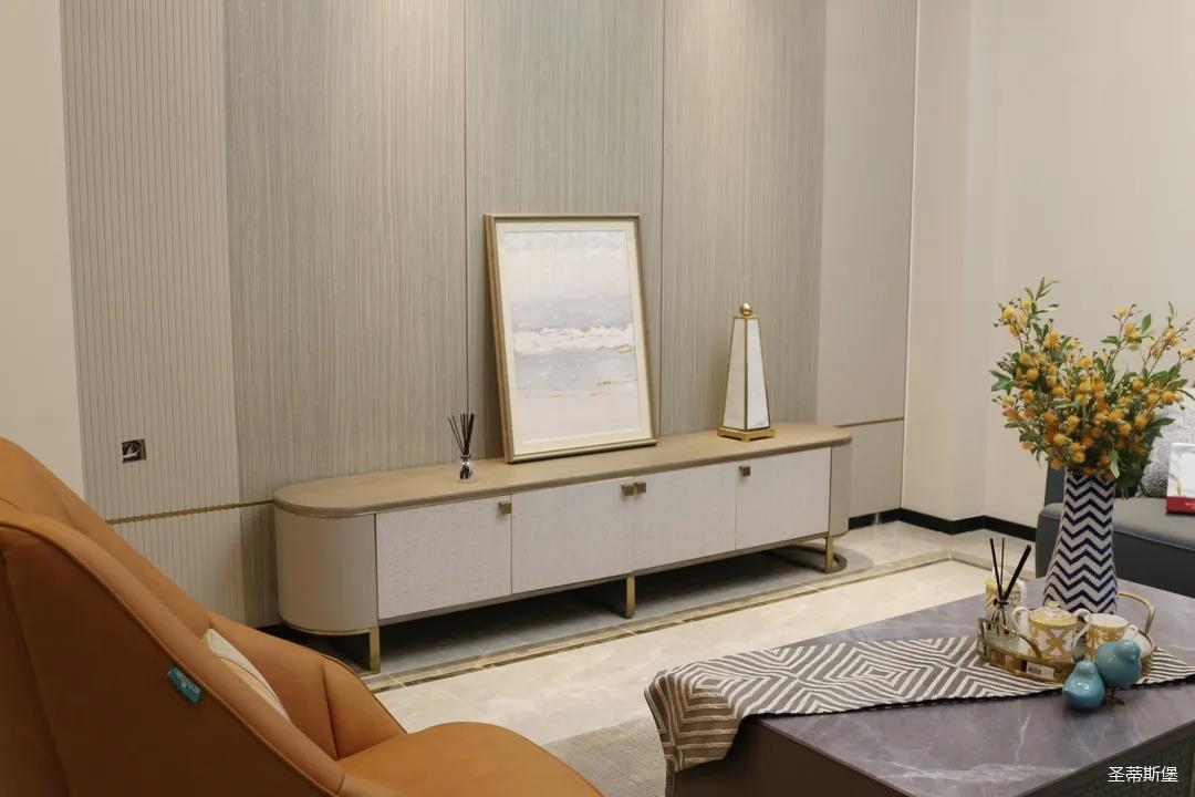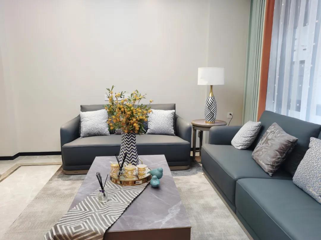 淺灰為基底的飾面與低飽和度的深色沙發(fā)相互映襯,產生強烈的視覺沖擊,深色的家具讓空間從視覺上衍生出一種縱深感。巖玻的質感與真皮編織的紋理盡顯現代之美,細節(jié)陶瓷擺件注滿了空間優(yōu)雅的藝術氛圍。
