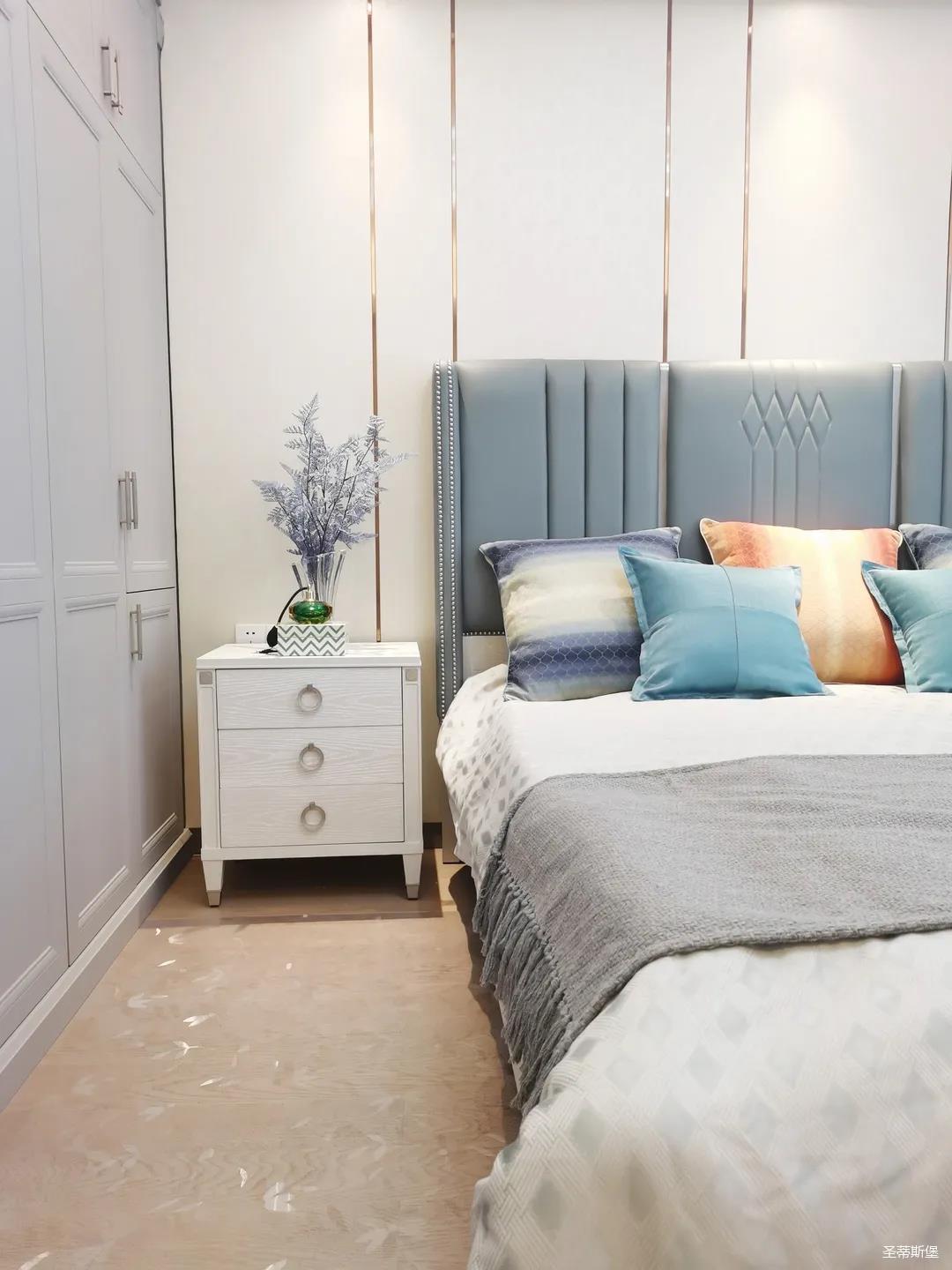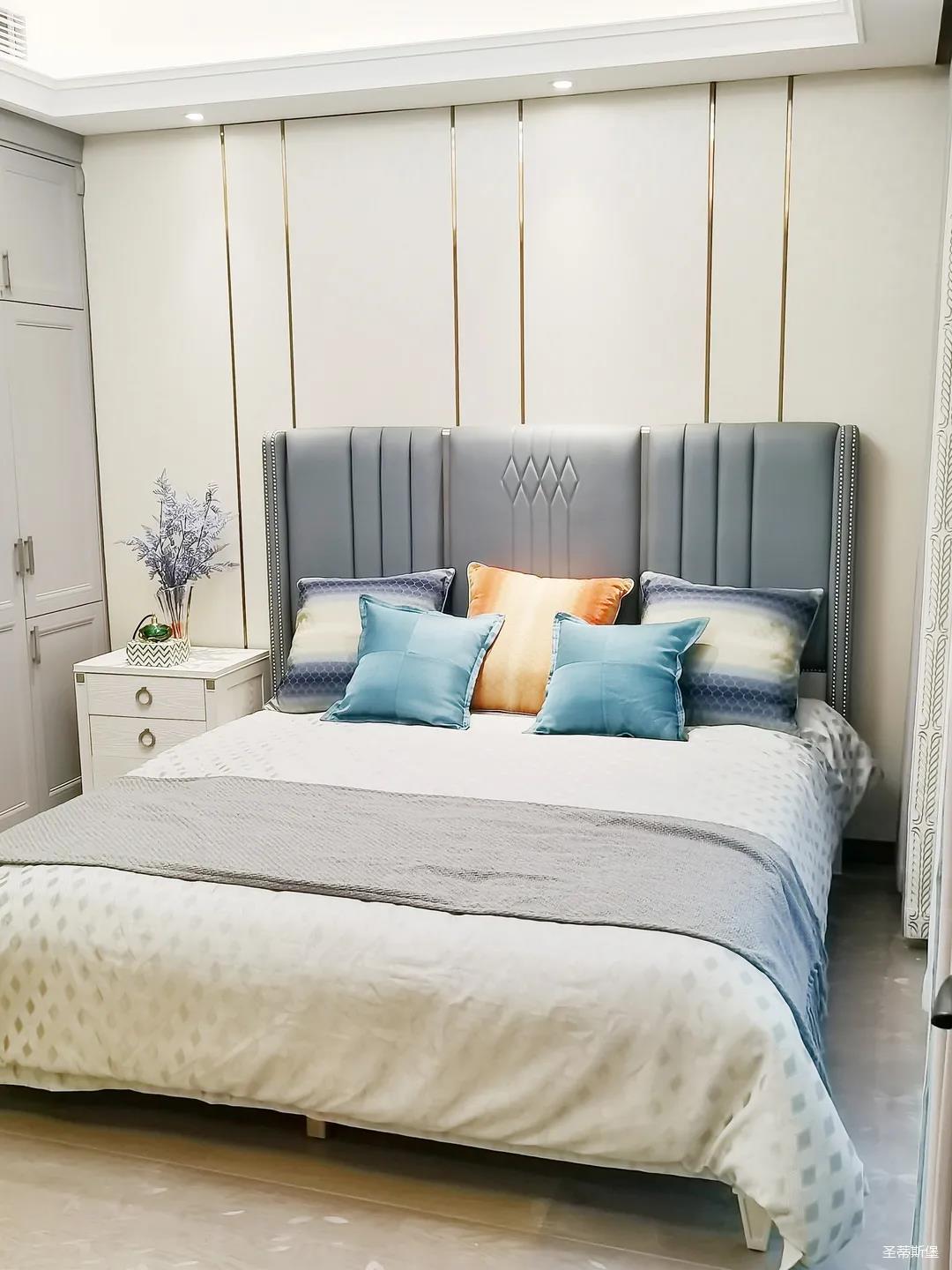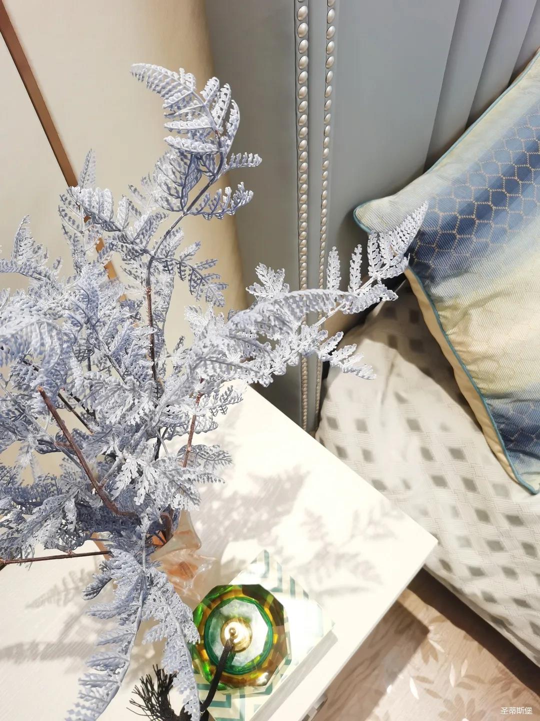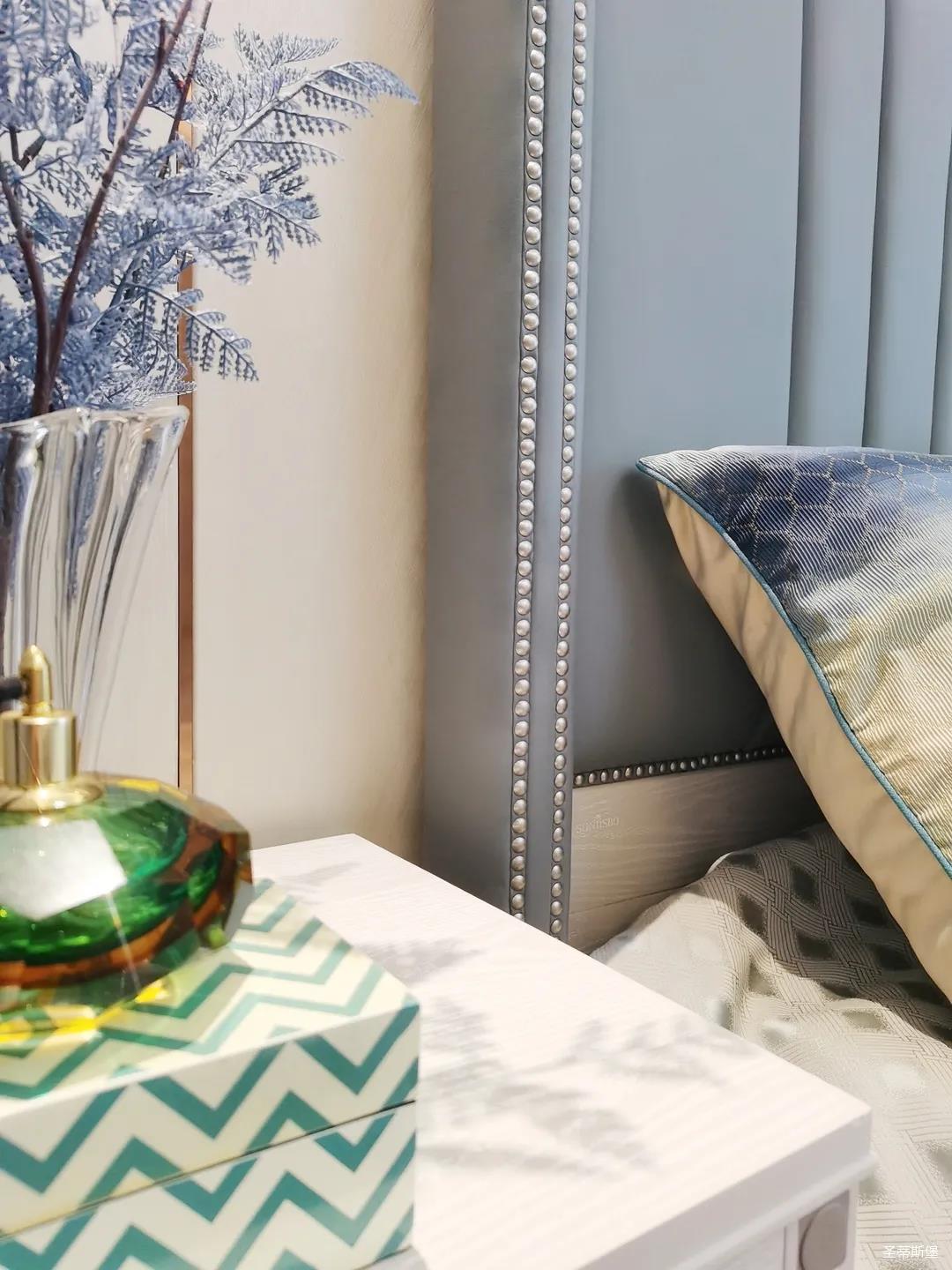 一樓的房間業(yè)主是作為長輩房,采用輕奢的背景墻面,結合亮眼的金屬線條設計,空間顯得時尚又不失沉穩(wěn)。莫蘭迪色的淺藍床屏,在無主燈設計與自然光線的碰撞下醞釀出不同的光影美感。