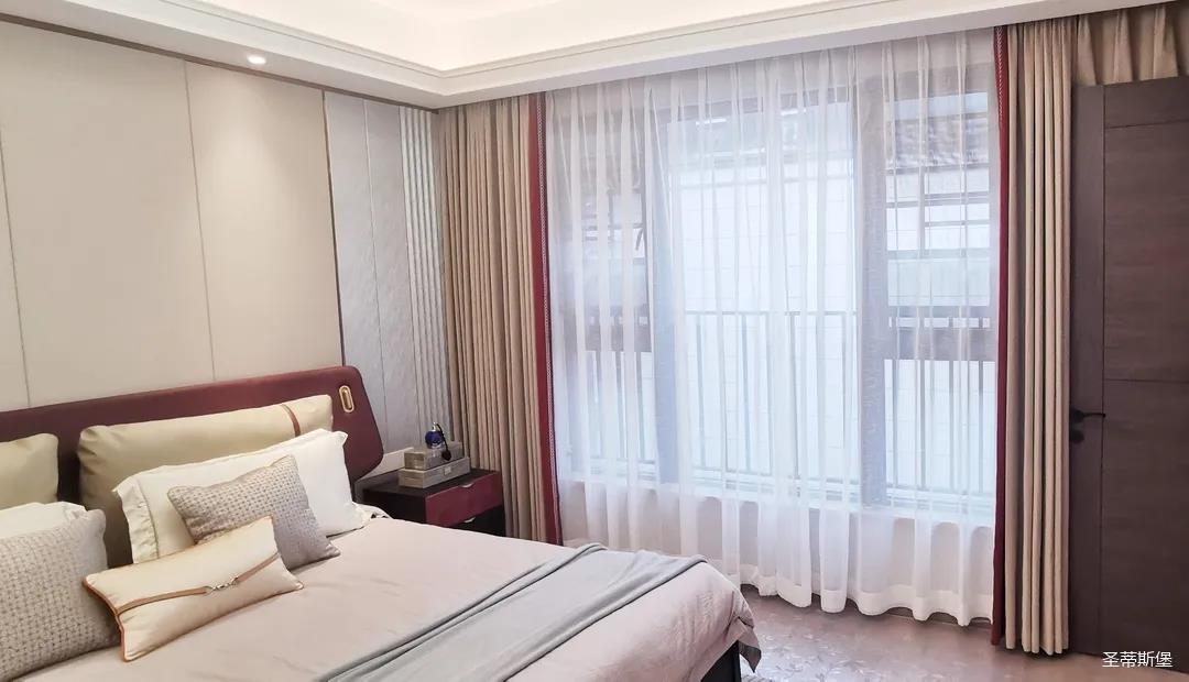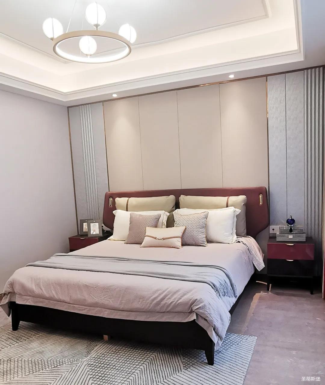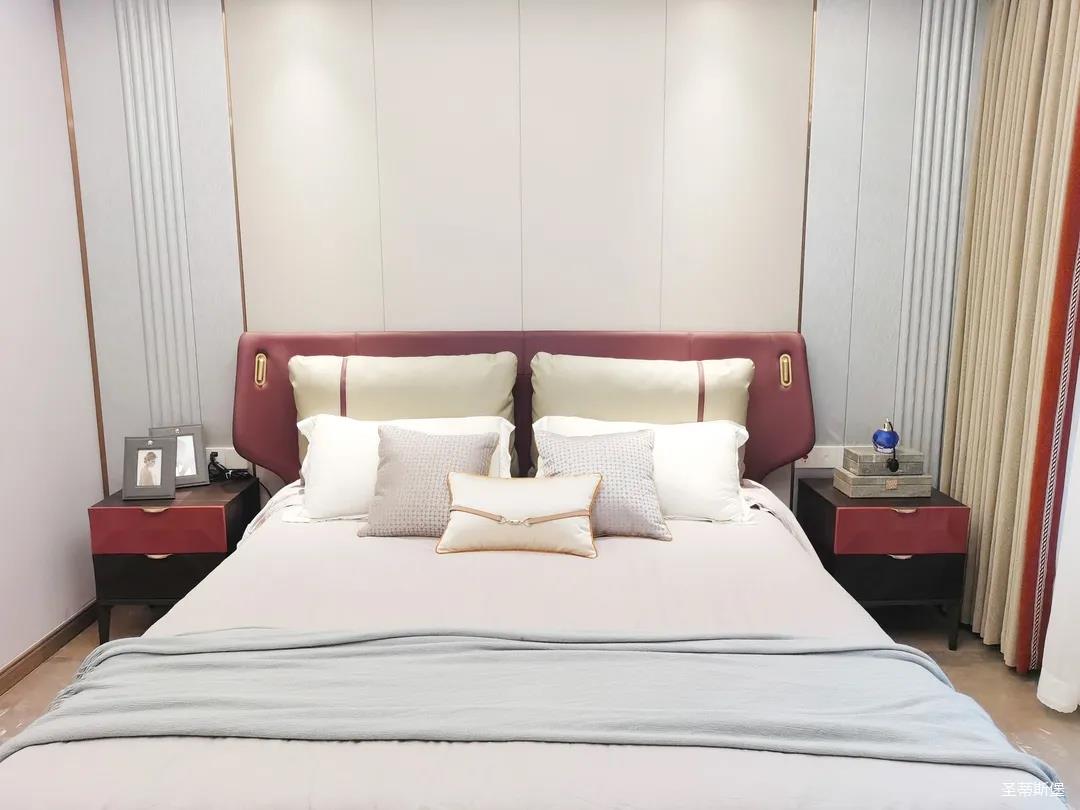 三樓的主人房設計風格更偏向簡約,浪漫的酒紅色床屏運用了曲面造型,融合了極簡主義美學和輕奢元素,小型夜間感應燈設計讓每一處細節(jié)都充滿著時尚優(yōu)雅的氣息。夜間倚靠在厚實的軟包上,時光好像在不知不覺中慢了下來,讓我們能品味和咀嚼生活的氛圍。