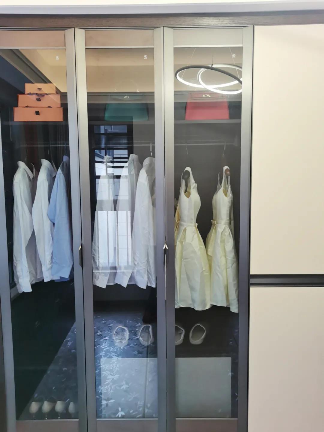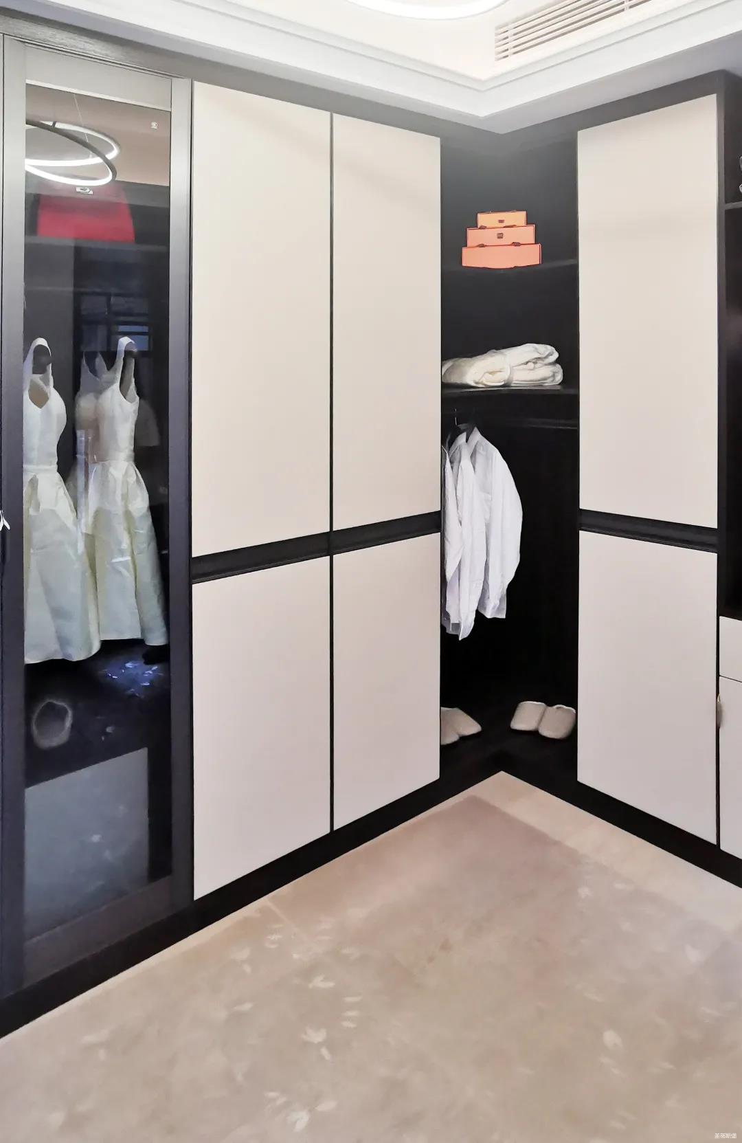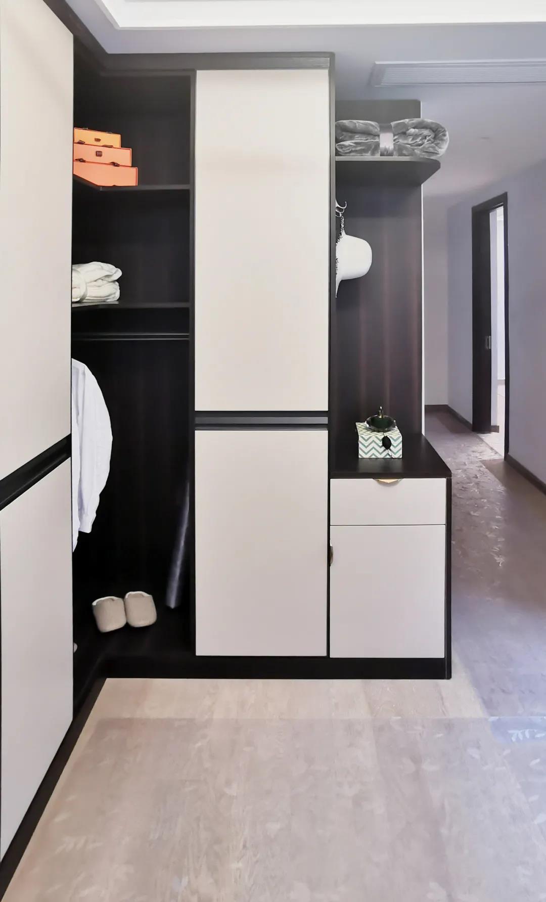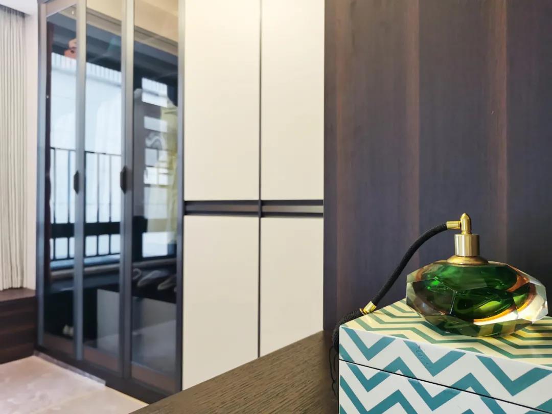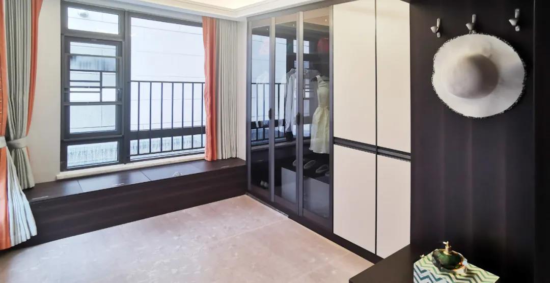 衣帽間以現代極簡設計手法引入輕奢元素,借助實木與金屬組合打破了傳統儲物區(qū)的沉悶感,煙熏色橡木紋的定制柜體,色澤好似一杯溫暖醇香的摩卡,令空間層次感與立體感的格調頓生,予以沉穩(wěn)舒適感官體驗。