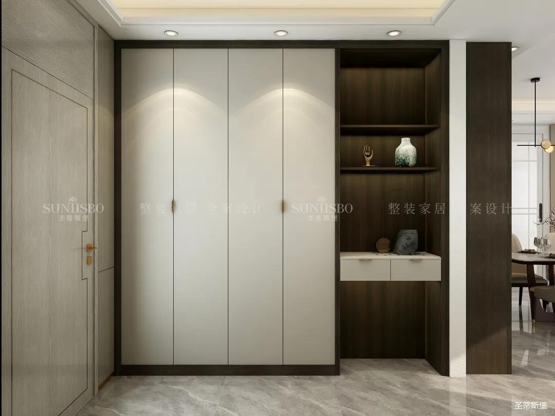 衣帽間采用了虛實結(jié)合的設(shè)計,構(gòu)筑起規(guī)整而有序的置物區(qū)域和功能齊全的收納系統(tǒng),煙熏色實木作為空間的主要元素,環(huán)抱著整個衣帽間,張揚又不失沉穩(wěn),恰到好處地搭配金屬玻璃置頂高門和感應(yīng)燈光系統(tǒng),挑高了空間效果,也詮釋著現(xiàn)代極簡線條美感和對極致的生活追求。