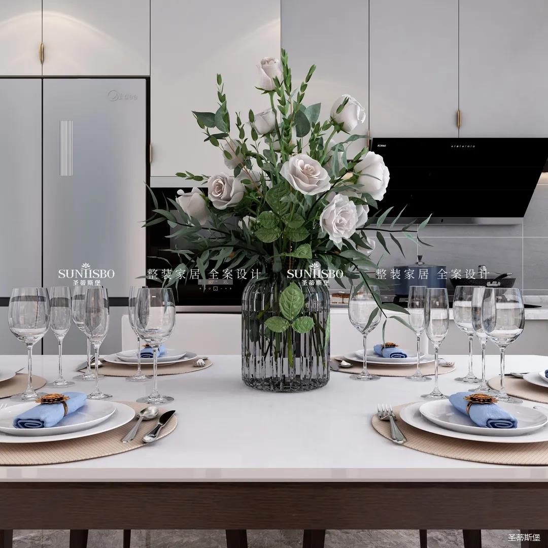 餐廳中大理石肌理的桌面自然袒露,自然親膚的觸感、皮革質(zhì)感的現(xiàn)代餐椅坐感舒適自然。沉穩(wěn)的實木材質(zhì)延伸,精致的瓷白餐盤搭配金屬質(zhì)感的物件,通透的玻璃器皿點綴其中,契合了業(yè)主對品質(zhì)生活的追求。