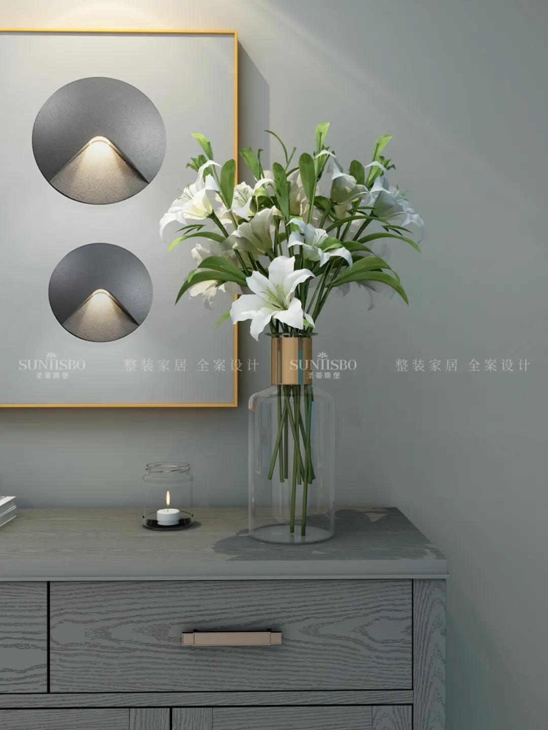 入戶側(cè)面設計一字型玄關,腰部,底部留空做層板,便于隨手放置鑰匙、鞋包等物品,中間留空設計為開放展示區(qū),加上軟裝飾品點綴,達到業(yè)主對品質(zhì)生活追求的理想狀態(tài)。應女主人要求,玄關還加長延伸出妝鏡和換鞋凳,讓動線自然流暢。