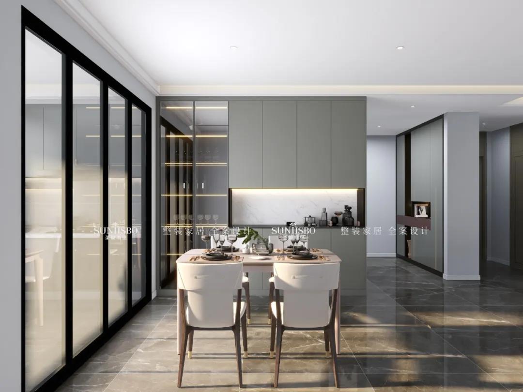 灰色平板門和煙熏色柜體做深淺搭配,搭配深灰鋁框門,整體簡單又大氣,再點綴一抹赤紅色,點亮了整個空間。