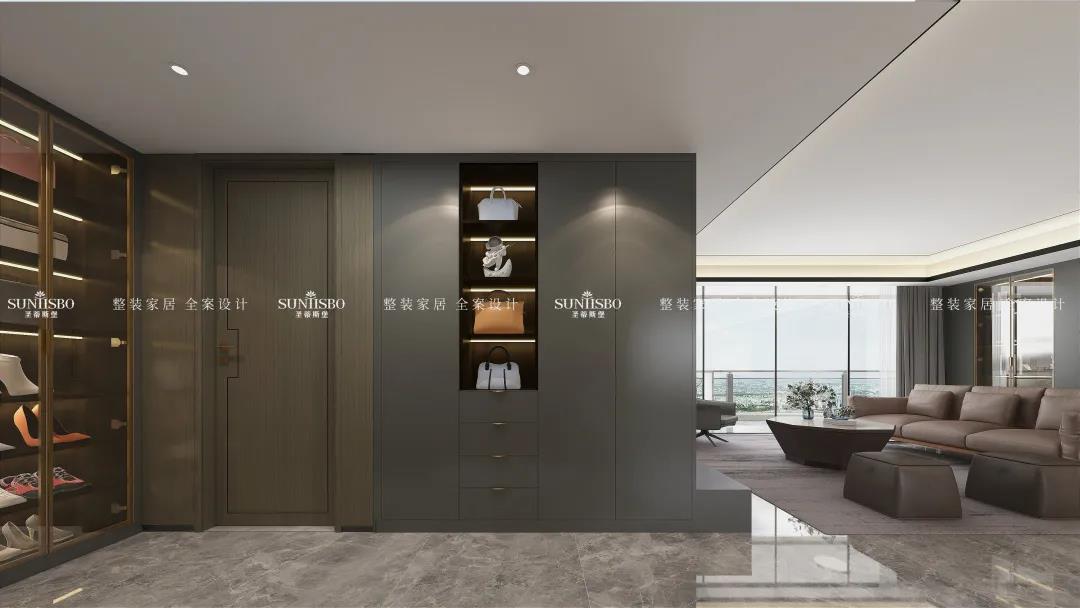 入戶采用的是煙熏色,搭配金屬把手,配合透明的鞋柜,整個空間看起來簡約時尚大氣,男主人表示這就是他想象中的樣子。