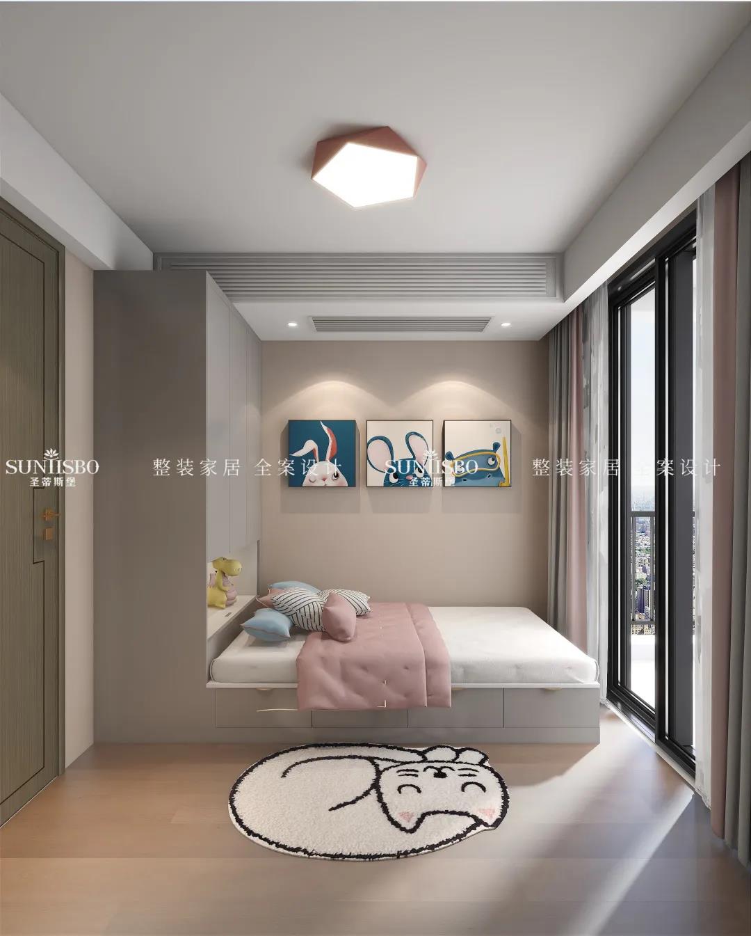 在設(shè)計(jì)之前,業(yè)主就預(yù)留了寶寶房,寶寶房實(shí)用又溫馨,榻榻米床可以做收納柜使用,收納寶寶的換季衣服、玩具等。在色彩上搭配也是采用的莫蘭迪色系。這樣的兒童房誰能不愛呢?