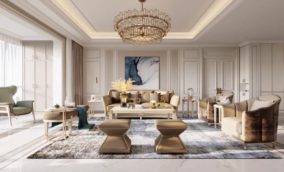 本案定位美式輕奢風(fēng)格,設(shè)計(jì)師提取了業(yè)主喜歡的顏色添加至空間中,并運(yùn)用金屬元素滲透到每一個空間,統(tǒng)一色調(diào)。在設(shè)計(jì)上,格局大而不空,以優(yōu)美線條雕琢空間語言,材質(zhì)肌理間的碰撞融合,打造出層次豐富的藝術(shù)感。