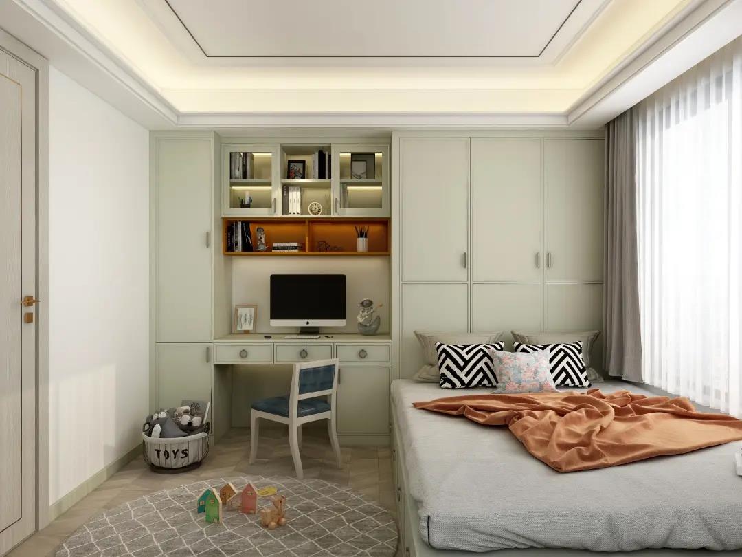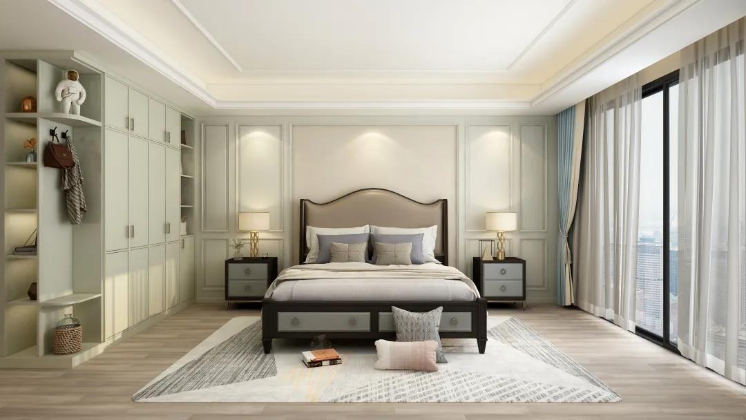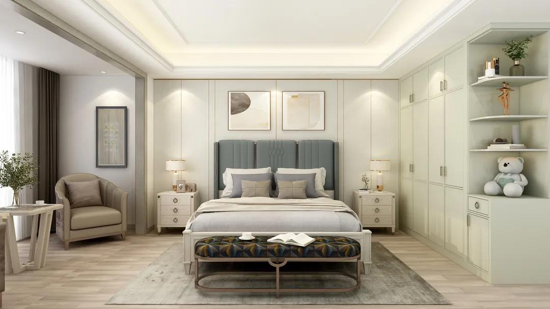 次臥背景墻兩端是對(duì)稱(chēng)式設(shè)計(jì),以淡雅的暖色為主,