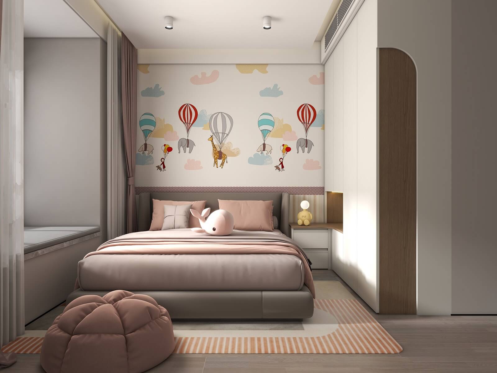 兒童房采用溫柔的奶白作為空間底色,整墻卡通貼畫搭配奶油白衣柜,在細節(jié)上用粉色裝飾作為跳色,無形中增加立體感和層次感,營造出童真舒適的兒童夢中情房。